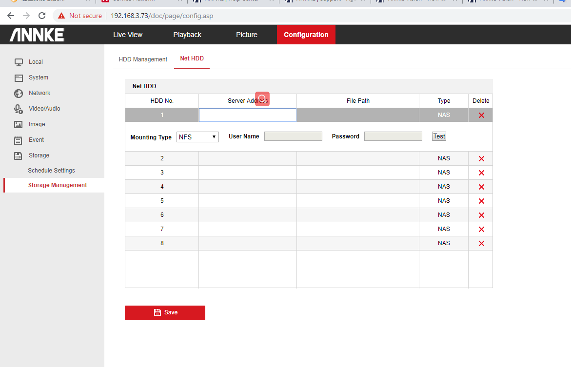 12. Go to Net HDD. Click the Gray shift to enter the IP address of NAS. And the file path that you created for the camera on step 9.