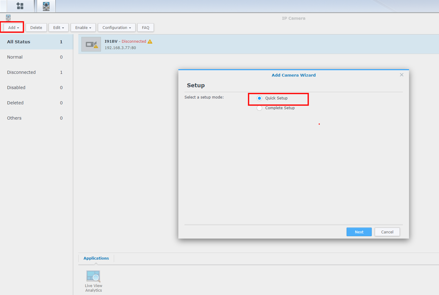 Both the NAS and camera should be connected to the same router/network by Ethernet cables.
