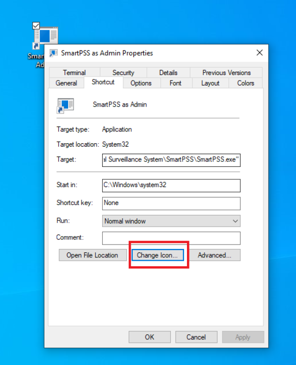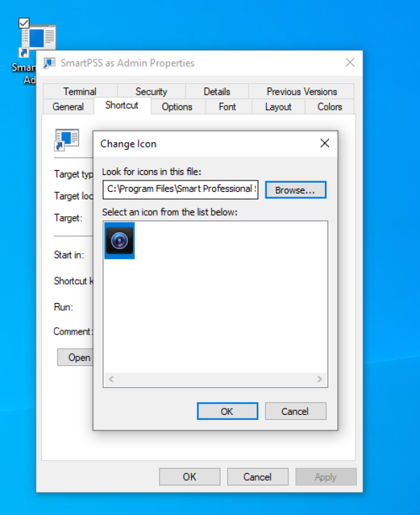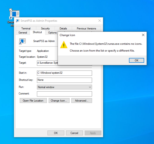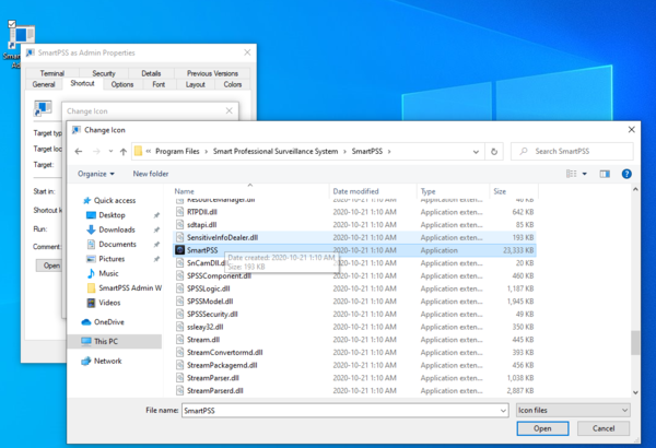 8. Right click the shortcut, then choose change icon like in the screenshots below. It may give you an error about no icons being available. Just click ok. Now navigate your way to the SmartPSS folder again, choose the SmartPSS executable. Now on the next screen it will give you the SmartPSS icon. Choose it and click ok. Now your shortcut will have the proper icon.