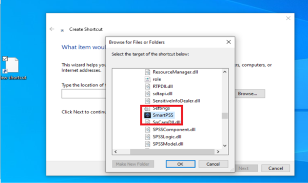 3. You will get a screen that asks you to choose the file location. Click on the browse button and then navigate to the SmartPSS.exe. The default location is C:\Program Files\Smart Professional Surveillance System\SmartPSS\SmartPSS.exe. Once you locate the file, click ok.
