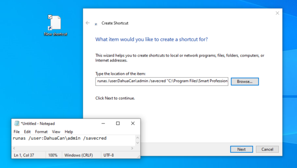 5. Now you want to take the example syntax and modify it to match your computer name and username. As an example our computer name is DahuaCan and our admin account username is admin. So in the next screenshot you can see we modified the syntax to include our computer name and username. Now you want to add that syntax to the beginning of the location. After you fill that in like the screenshot below and click next, give your Shortcut a name. I called ours SmartPSS as Admin.