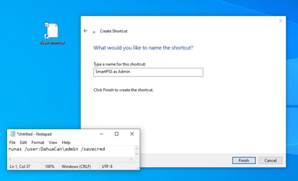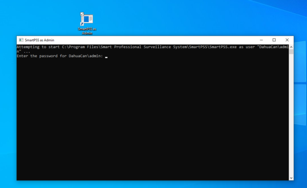 7. After you click Enter, it should then run SmartPSS using those admin credentials. Those credentials are now saved, so even if you close SmartPSS, even if you log out of the user account or reboot the computer, you can just click on the shortcut on the desktop and it will always use the credentials you already provided it. Your shortcut should now be good to go for that user. If you want to know how to change the shortcut icon, you can continue onto the following steps.