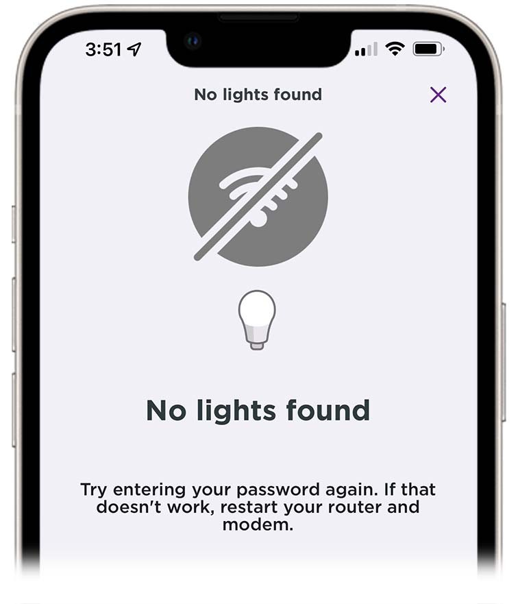 You may see an error like “Connection failed”, “Hub not found”, “No lights found”, or “No plugs found” in the mobile app.