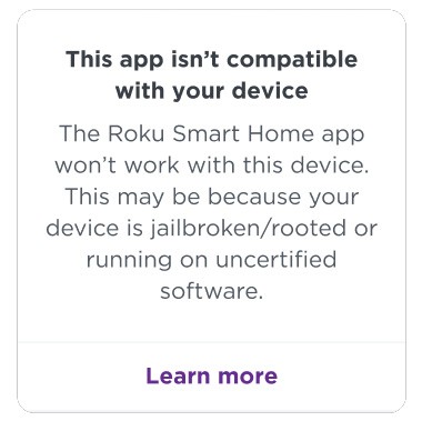 If you receive error “The app isn’t compatible with your device” in the Roku Smart Home mobile app, the app may not work because your phone or tablet is jailbroken, rooted, or running uncertified software.