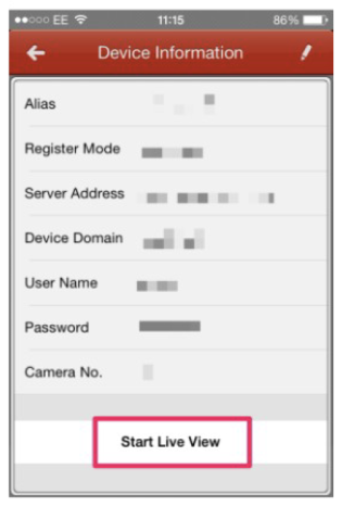 Step 6 Start Live view After a few seconds you see a start live view button appear at the bottom of the screen, press it to start viewing your cameras. If start live view does not appear, check your settings and make sure if you are at home that you are on 4G/another WIFI AP than your home WIFI. As this is a remote connection. It will not work when you’re at home unless you connect via 4G.