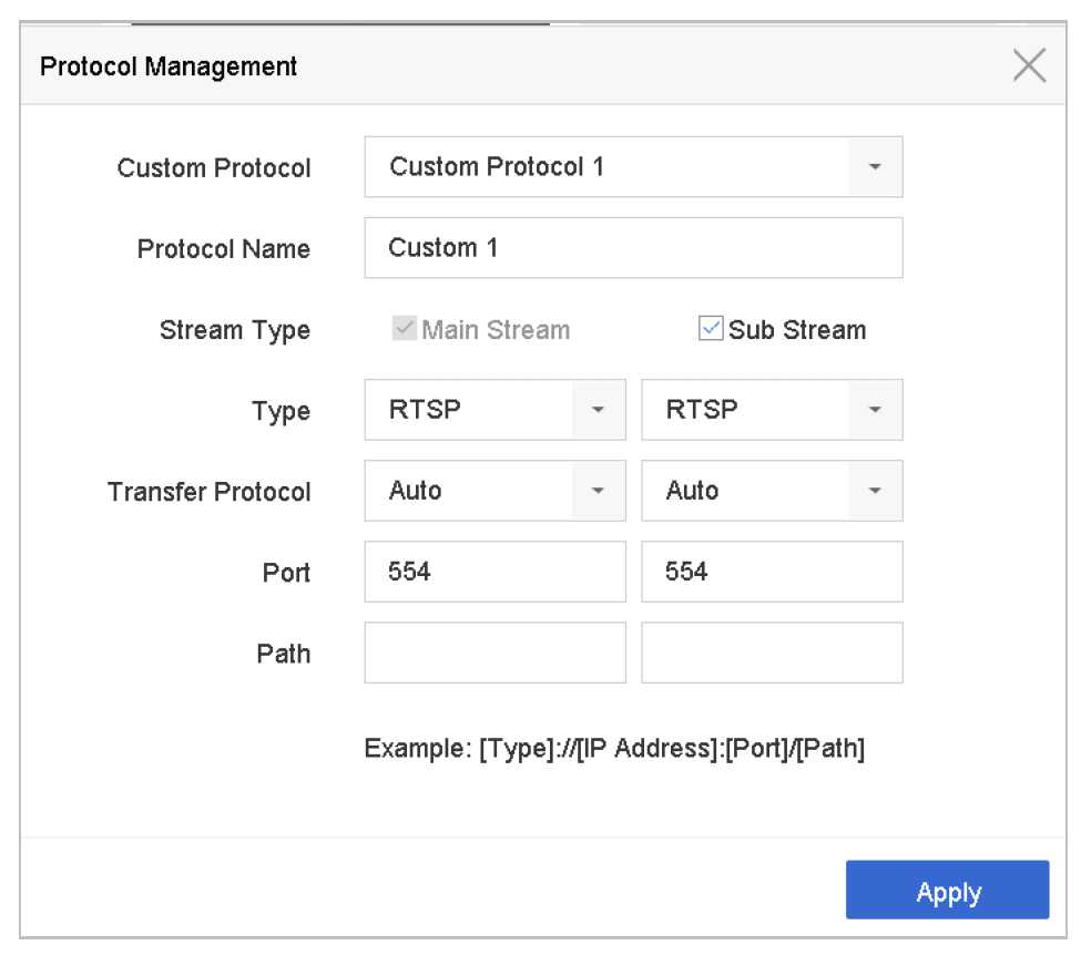 Note: The protocol type and the transfer protocols must be supported by the connected IP camera. After adding the customised protocols, the protocol name will be listed in the drop-down list.