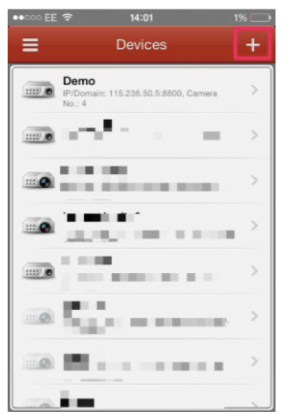 Step 4 Add a new device A list of devices will appear. If this is the first time that you have used the app a preconfigured ‘demo’ device will appear. To add your own device by pressing the + sign at the top right.
