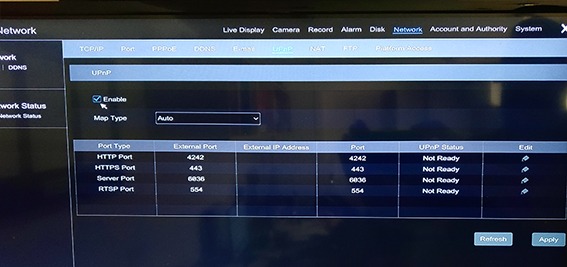 On the DVR, log into the menu, and then navigate to Setup → Network → NAT. Make sure that NAT is enabled (Note: you will not be able to access the cameras if NAT is not enabled).