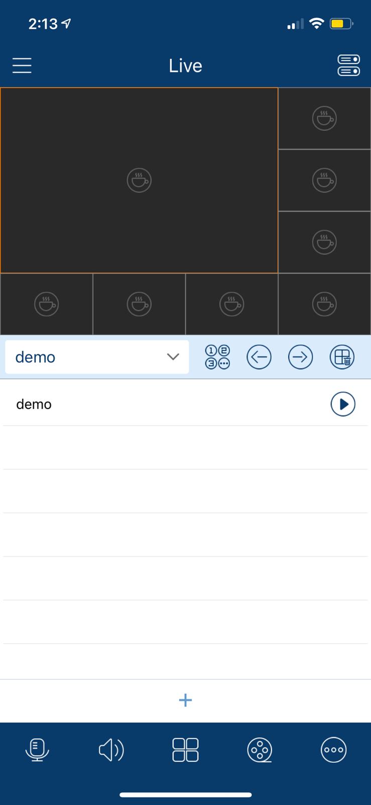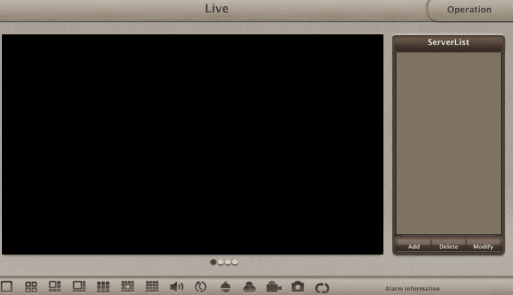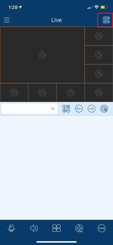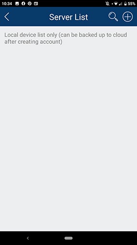 Now that the QR code/serial number has been found we can focus on setting up the application. The first screen that you will see when you open the app is the Live View screen. From here, you can add a device by hitting the icon in the upper-right hand corner. This will open up the Server List.
