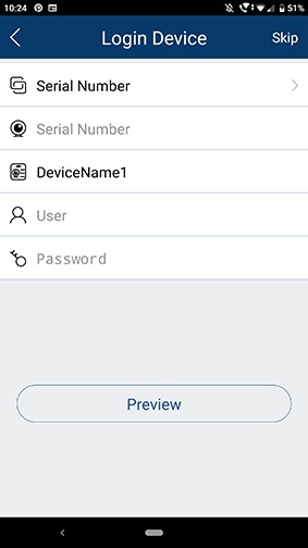You will now need to fill in the details for the connection: The serial number (which can be found on the NAT page which should still be displayed on your monitor). A nickname of your choosing the default being “DeviceName1” and Username/Password for the DVR. If you would like to bypass this stage tap on skip in the top right corner which will then take you to the Live page.