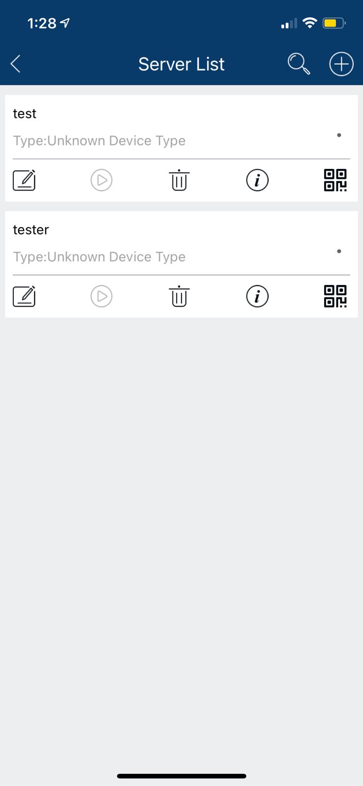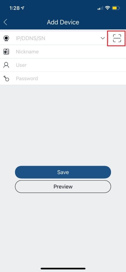 This page will list all of you connection entries, but at the moment there should be none. Tap on the “+” symbol in the top right and choose scan code and then scan the QR code on the DVR monitor screen, the information will be filled out for you for adding a device. You may still need to fill out the device name, user and password for the DVR and tap save.
