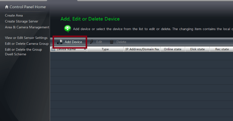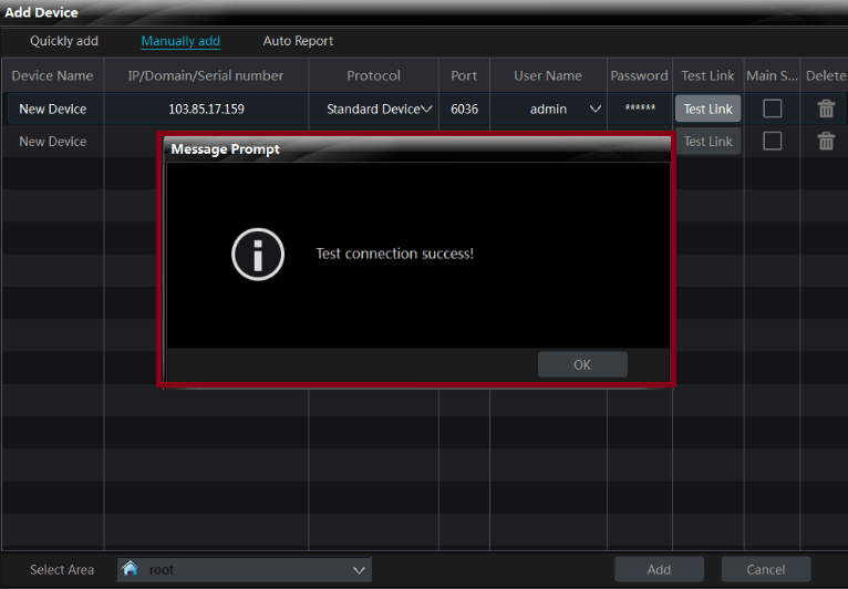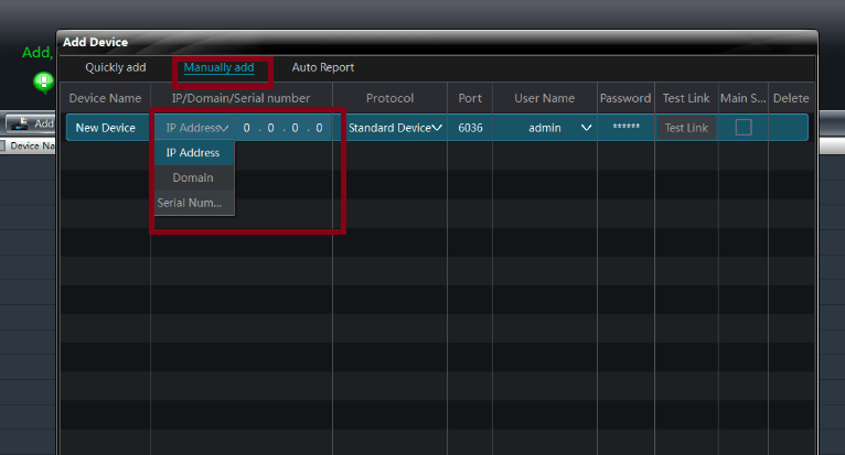 Click on the “manually add” option from the top of the screen. Here, you have to add a device serial number, IP address or a domain as per your mode of DVR/NVR’s registration.