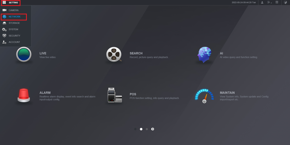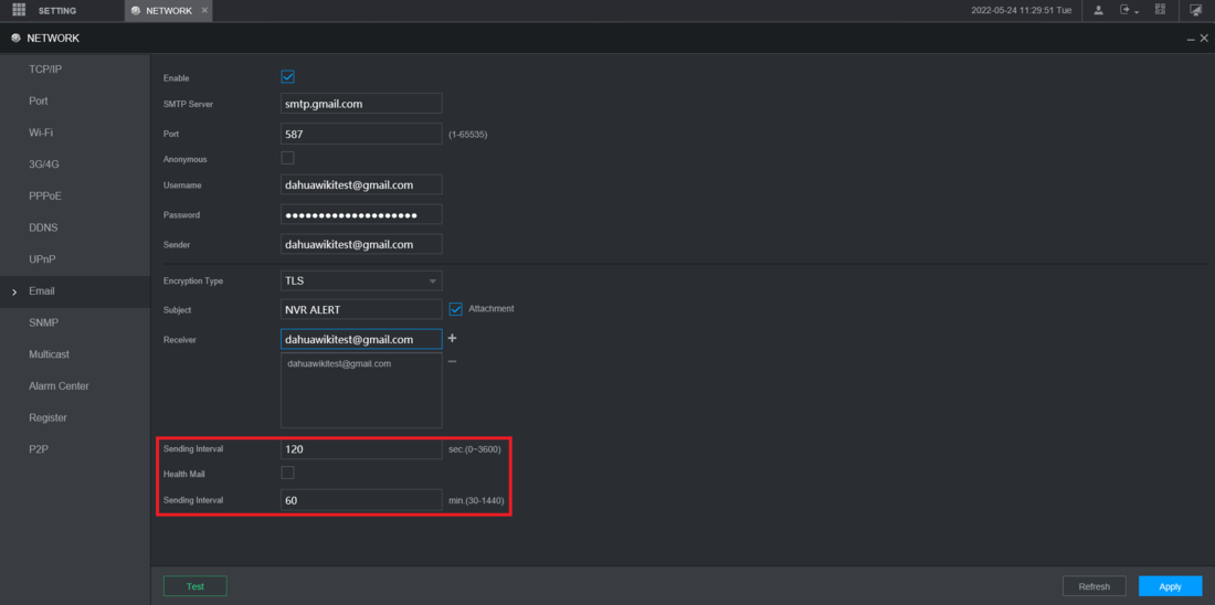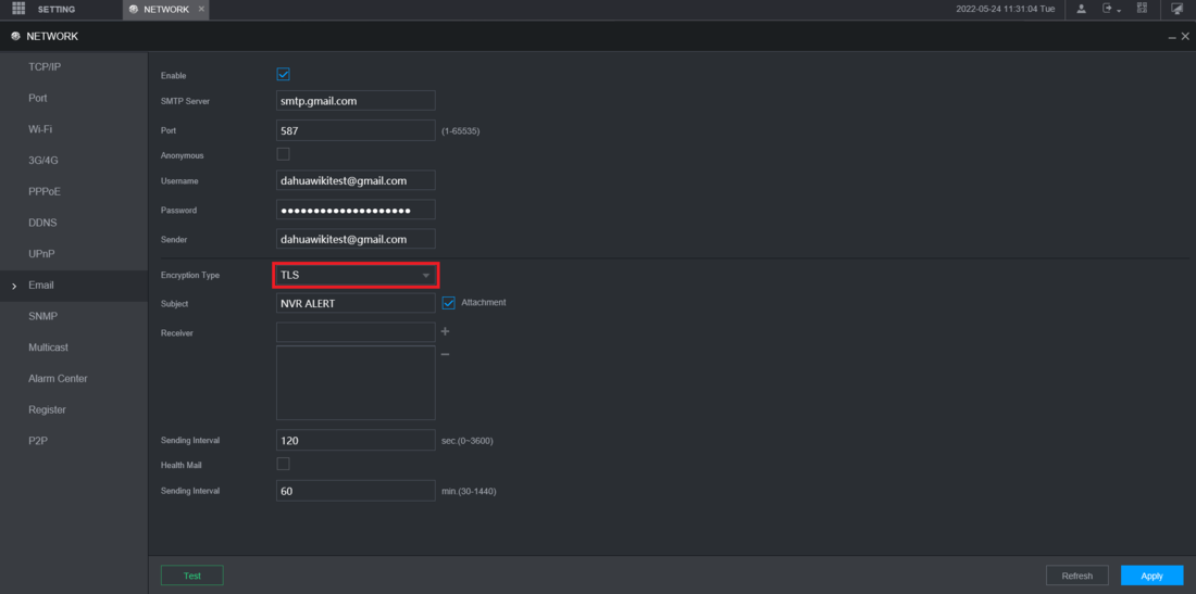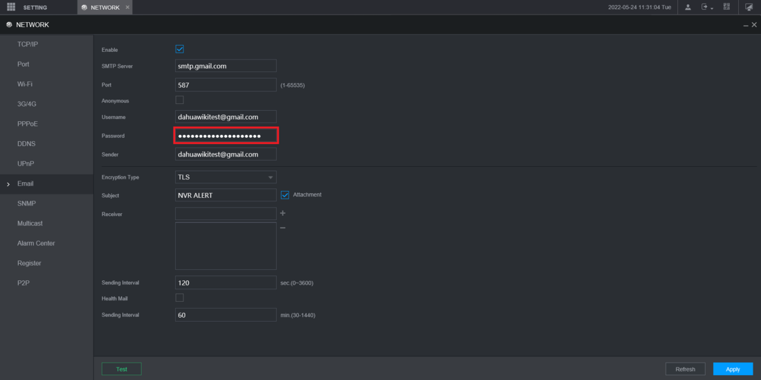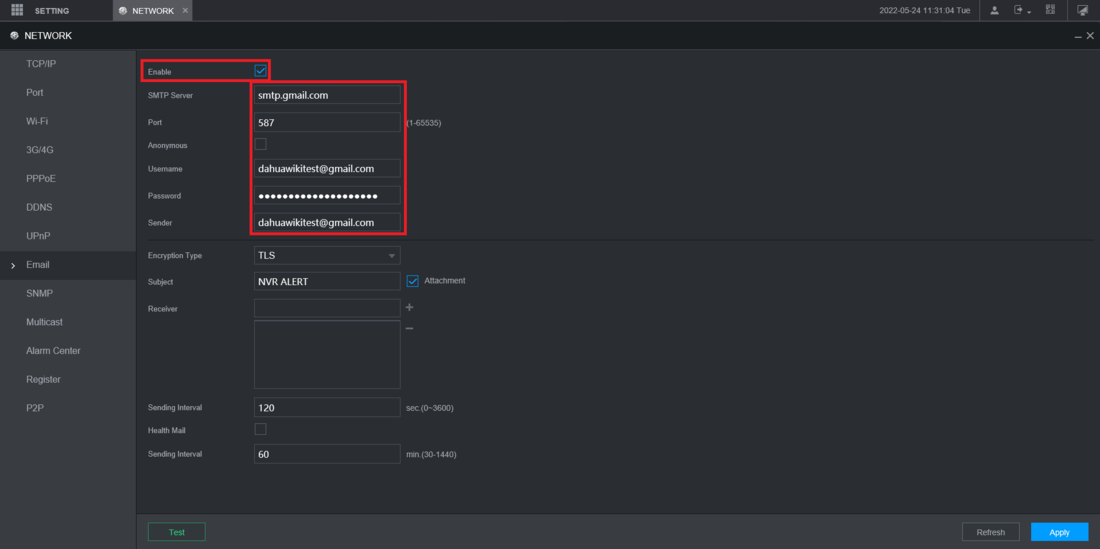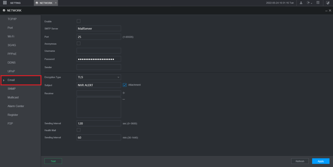 How to Setup Email Notifications via Gmail, Step by Step Instructions Log into the web interface of the NVR Then select Setting at the top left Select Network from the drop-down.