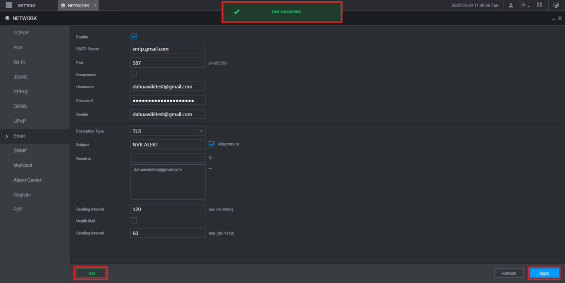 E-mail Test: Sends a test message to verify that the SMTP server can be reached.6. Click button to save the Email settings.7. You can click to test whether your Email settings work.