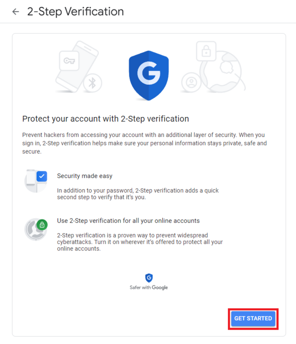 6. Select Get Started and then follow through all the steps to setup 2-Step Verification for your Gmail account