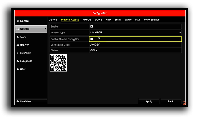 Make Sure that Platform Access is enabled and the status is Online. This video guide will walk you through how to accomplish this at the NVR/DVR with a monitor and mouse attached.