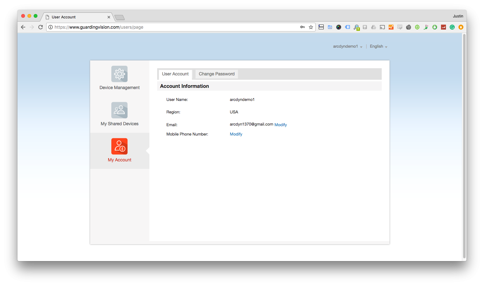 You will be forwarded to your account info page. Great Job! You are now registered with an account on guardingvision.com, you can now move on the adding your device to your Guarding Vision App.