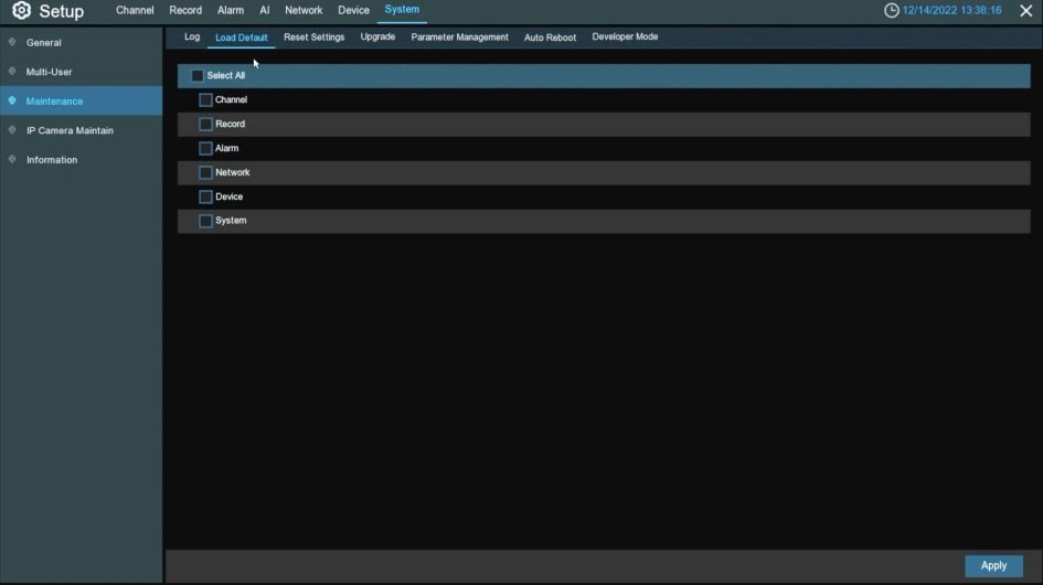 IMPORTANT: Selecting all checkboxes in the Load Default menu will reset all your recorder settings.