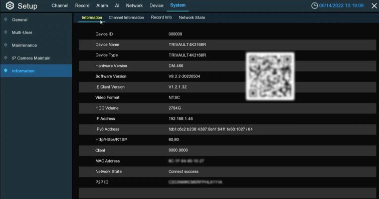 HDMI interface: DVR / NVR information is available under Setup >> System >> Information