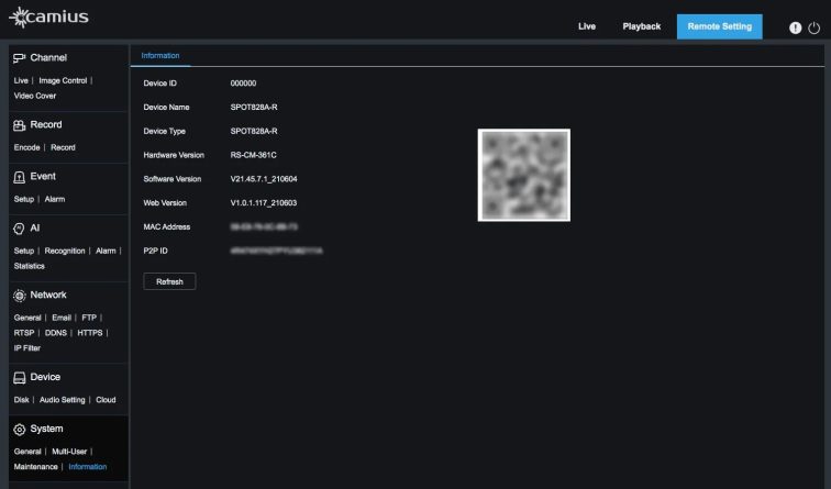 Web browser view: information is available under Remote Setting >> System >> Information (web browser view)