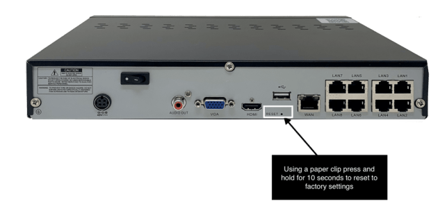 Picture 1 – Reset button of Camius 8 channel NVR [IPVAULT1128PR}