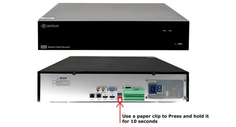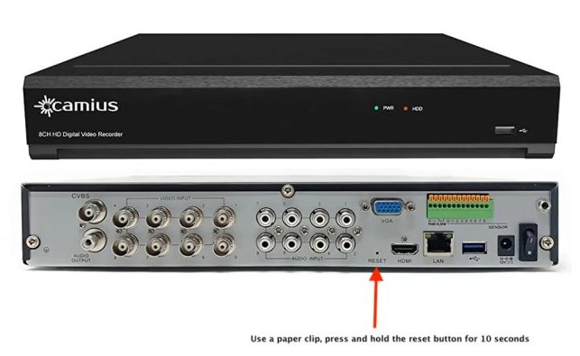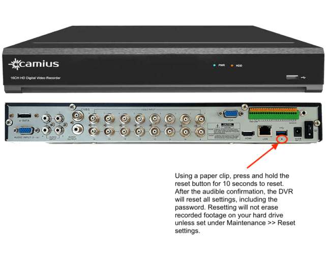 OPTION 1 – applicable to Camius security NVR, DVR with a reset button
