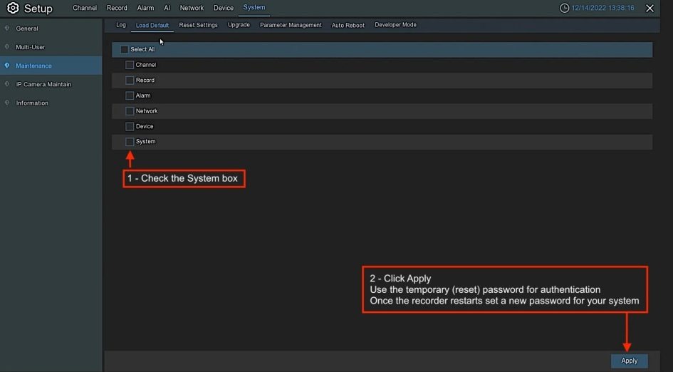 STEP 3 – Use the temporary reset password to Load the Default System settings, allowing you to set a new password for your Camius DVR or NVR.