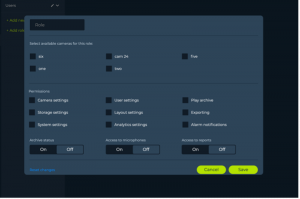 – Checkboxes setting the following permissions for this specific role: camera settings, storage settings, system settings, user settings, layout settings, analytics settings, camera archive access, exporting and alarm notifications.