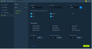 – Checkboxes showing current permissions set for the user: camera settings, storage settings, system settings, user settings, layout settings, analytics settings, camera archive access, exporting and alarm notifications.