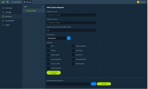 Go to Settings->Services->VMS->vCloud.ai VMS->VMS License Request, fill the customer e-mail and name fields, specify the required licenses and click Send License Request. Your request will be delivered to vCloud.ai sales team so, in return, you should receive the License activation key file to your email.