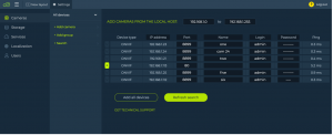 After specifying cameras’ credentials (name/login/password) you can add them one by one using the ‘+’ button on the left