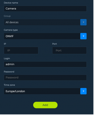 Name the camera, select connection type (ONVIF or RTSP) fill the IP address and port for ONVIF or the URL for the RTSP, fill Login and Password with camera’s credentials, select the time zone then click Add.