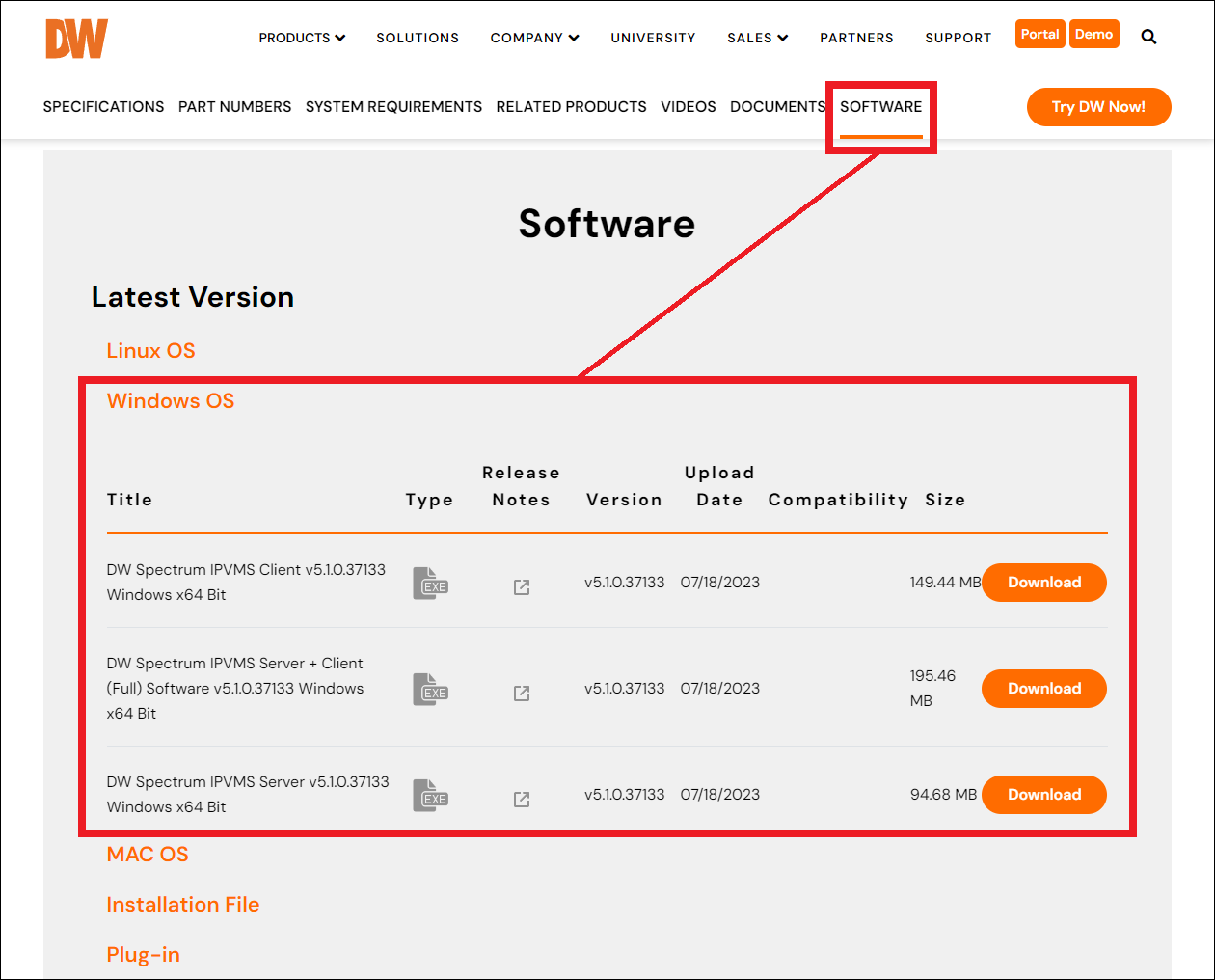Select the version of DW Spectrum that you want to install, then select the operating system that you will be installing with.