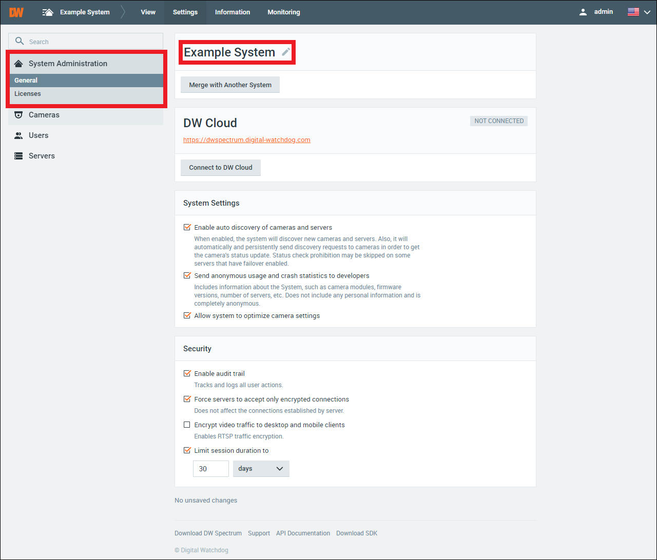 - To change the password of the local Admin user, launch DW Spectrum and connect with the System.