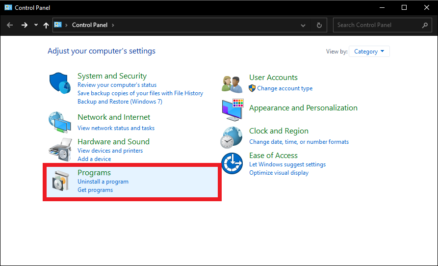 - Open Control Panel and click “Uninstall a program”to open the Programs and Features utility.