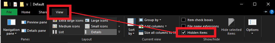 - In the File Explorer window, you will need to enable the View > Hidden Items setting.