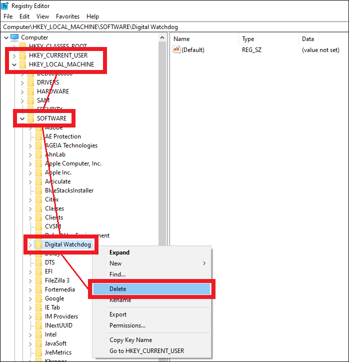 In Registry Editor, right-click on the “Digital Watchdog” folder and select “Delete” from the context menus in the following locations: