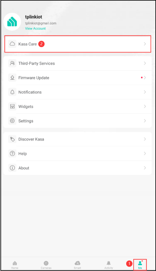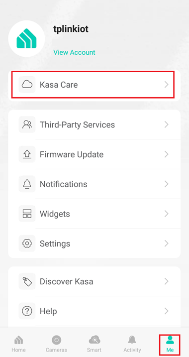 To view the Kasa Care plan, From the Kasa APP > Tap’Me’ on the bottom> Select Kasa Care