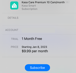 Your Kasa Care subscription starts on the day after your set up the camera successfully. You can select to use the free plan or purchase a monthly/yearly subscription. You will be billed on the same day when your monthly/yearly subscription is activated.