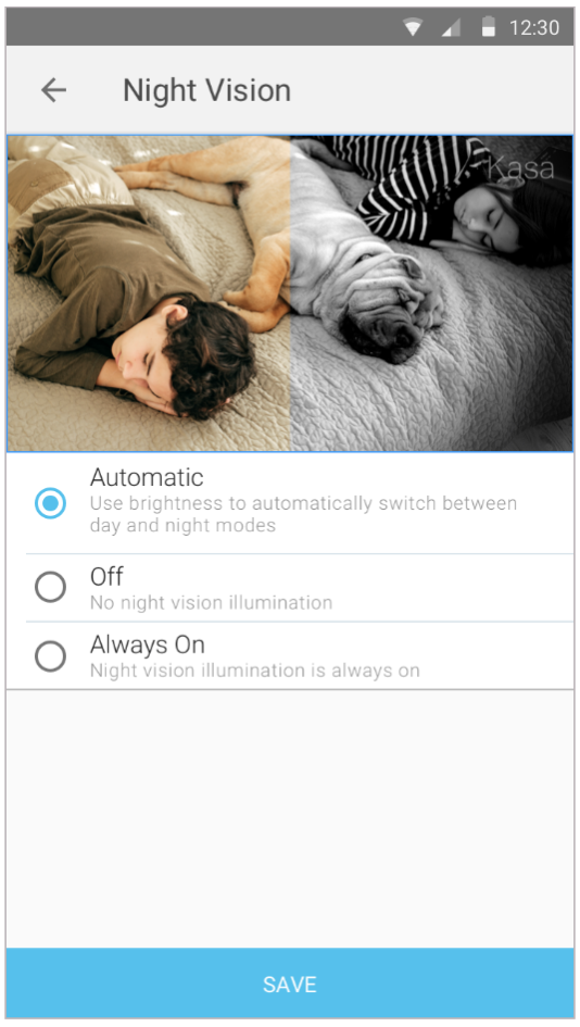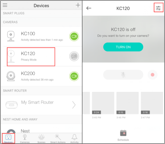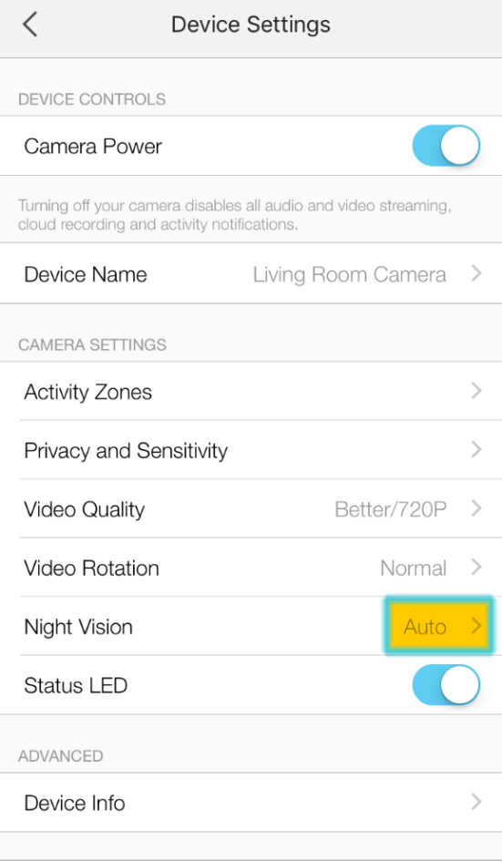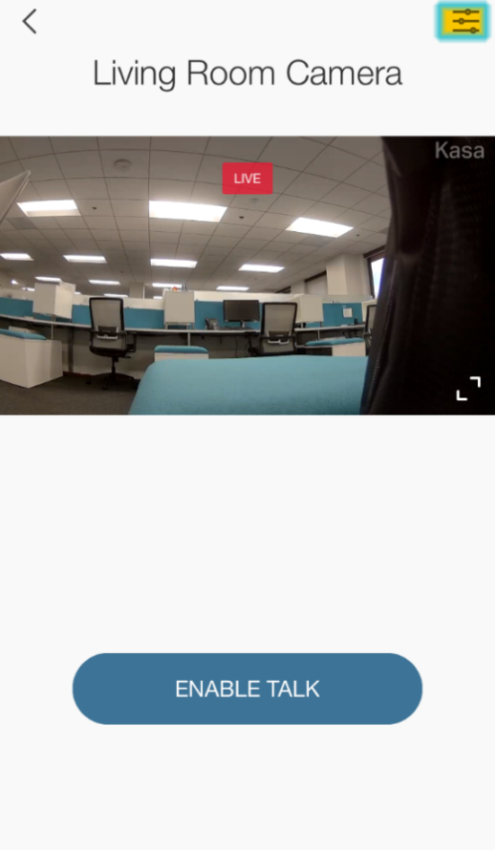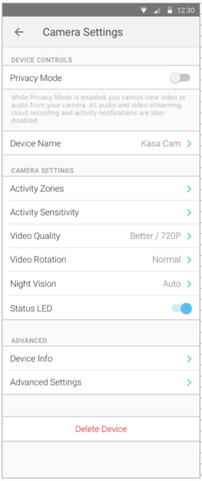 If you want to turn on or off the green LED on the front of the Kasa camera, navigate to your camera’s live view screen and access the device settings. Scroll down to a toggle switch for Status LED.