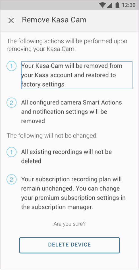 Your Kasa Cam will be removed from your account and restored to factory settings.