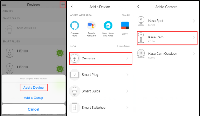 Step 2: Tap “+” button to add a Kasa Cam, select “Add a Device”, and choose “Cameras” icon according to your model number.