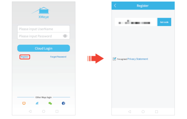 Launch XMEye App after installing, then follow these steps to add the DVR system.