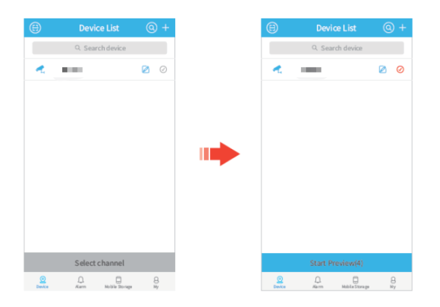 ② Tap on the name of the device to list all the cameras, you can select some certain channels to preview.