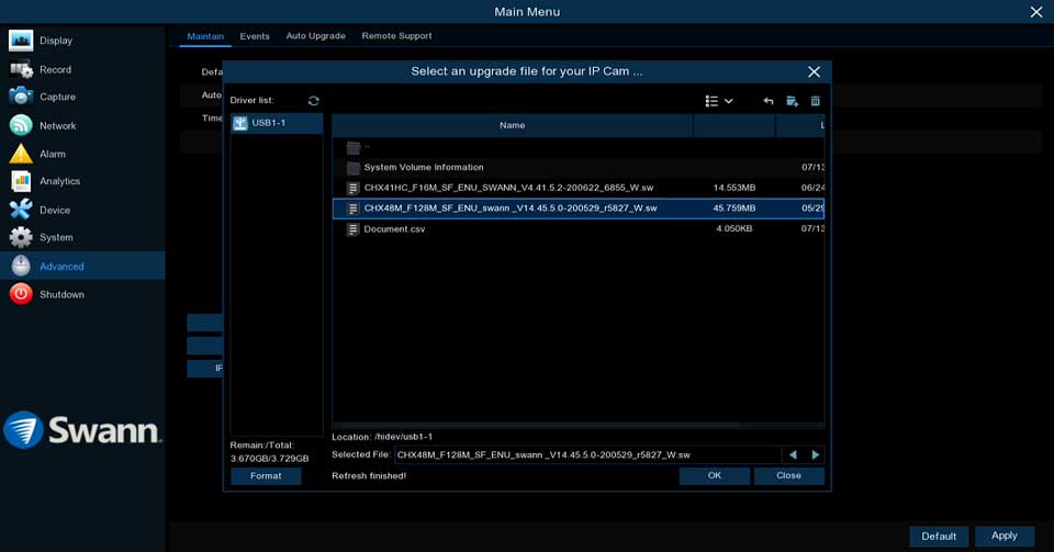 - Access your recorder’s MENU then to go ADVANCE > AUTO UPGRADE.