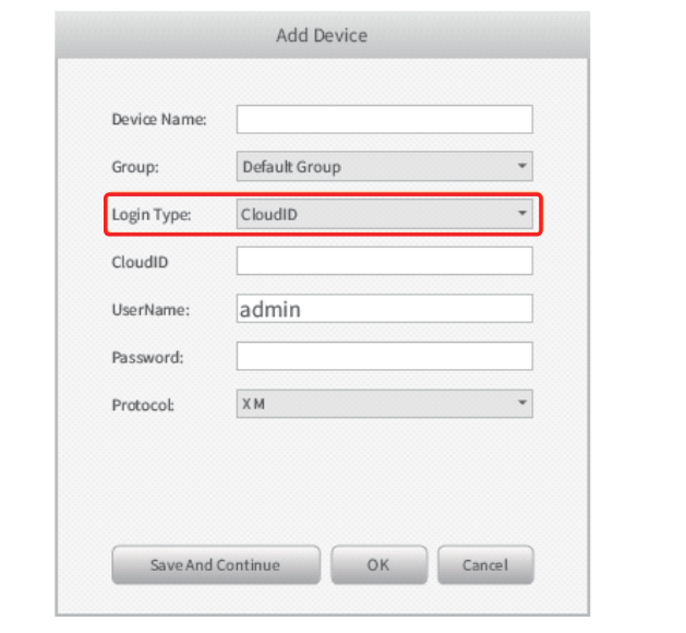 Change the Login Type from IP to CloudID and enter the required information on the interface of Add Device.