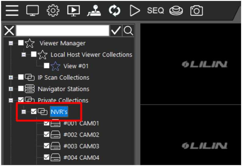 - To populate cameras to your new view, find the device (NVR, DHD, NAV) or individual cameras under your ‘Private Collections’ menu. Tick the boxes next to the devices you want to populate.