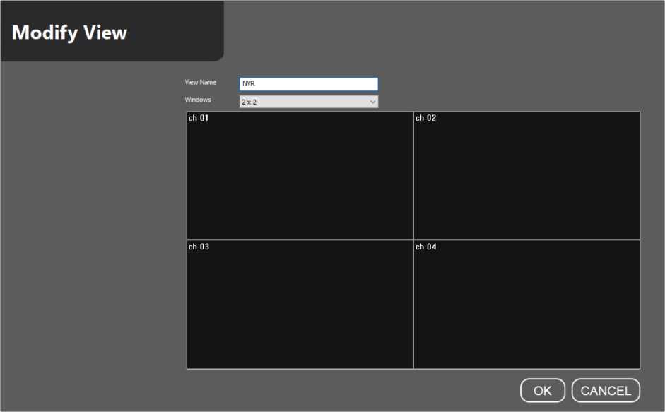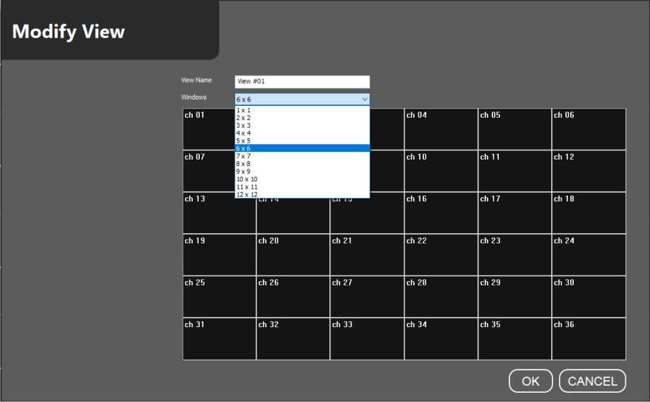 - A new window will appear. Enter a name for this view and select your chosen channel layout from the options that appear in the dropdown menu. These range from 1×1 (1 camera -full screen) to 12 x 12 (144 cameras).