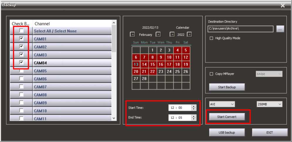 Select the cameras you want to include in your backup and click ‘Start Convert’ as shown above. This will create a .AVI file of the selected data.