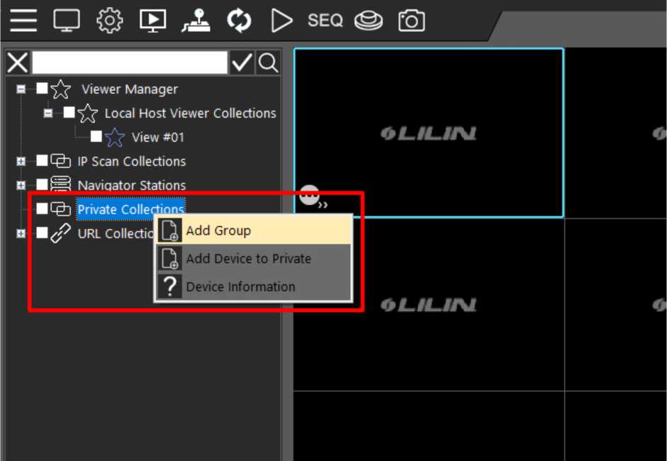 - To add a device to the client, right click on ‘Private Collections’ in the left menu and a mini menu will appear, select ‘Add Group’.